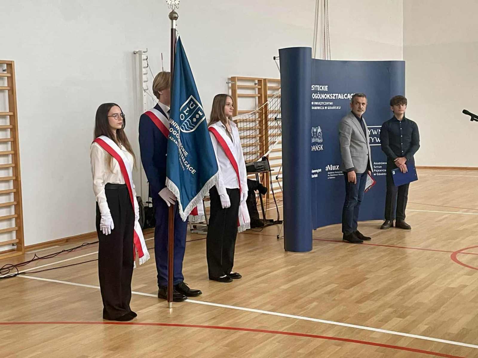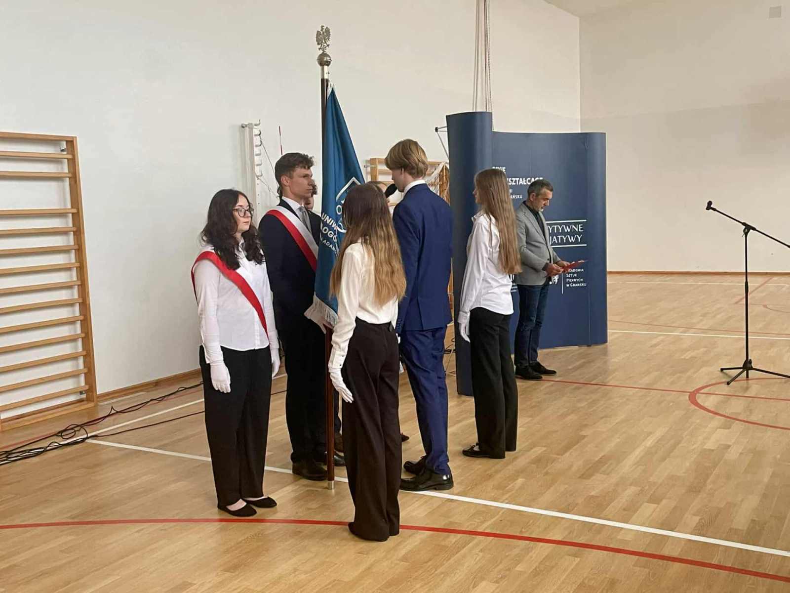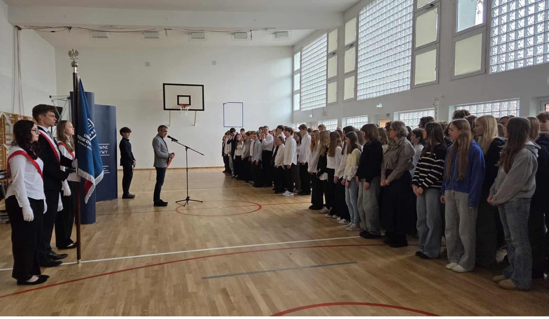 Pan Dyrektor rozpoczął od przypomnienia słów ślubowania, które uczniowie złożyli podczas uroczystej inauguracji roku szkolnego oraz pytania czy je pamiętamy i dotrzymujemy złożonego ślubowania. Następnie zaprezentowany został sztandar Szkoły i omówione zostały słowa znajdujące się na nim, po czym nastąpiło przekazanie Sztandaru nowemu pocztowi sztandarowemu.