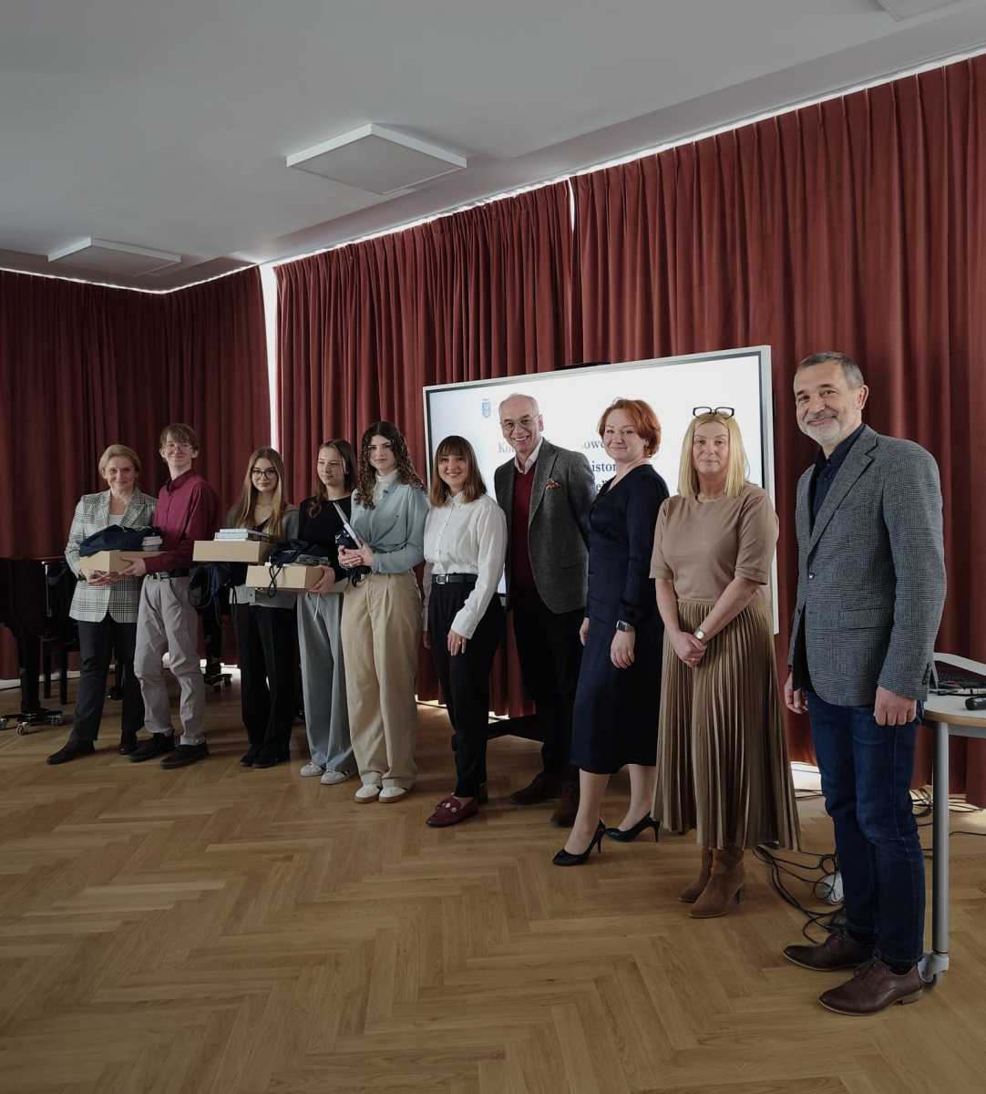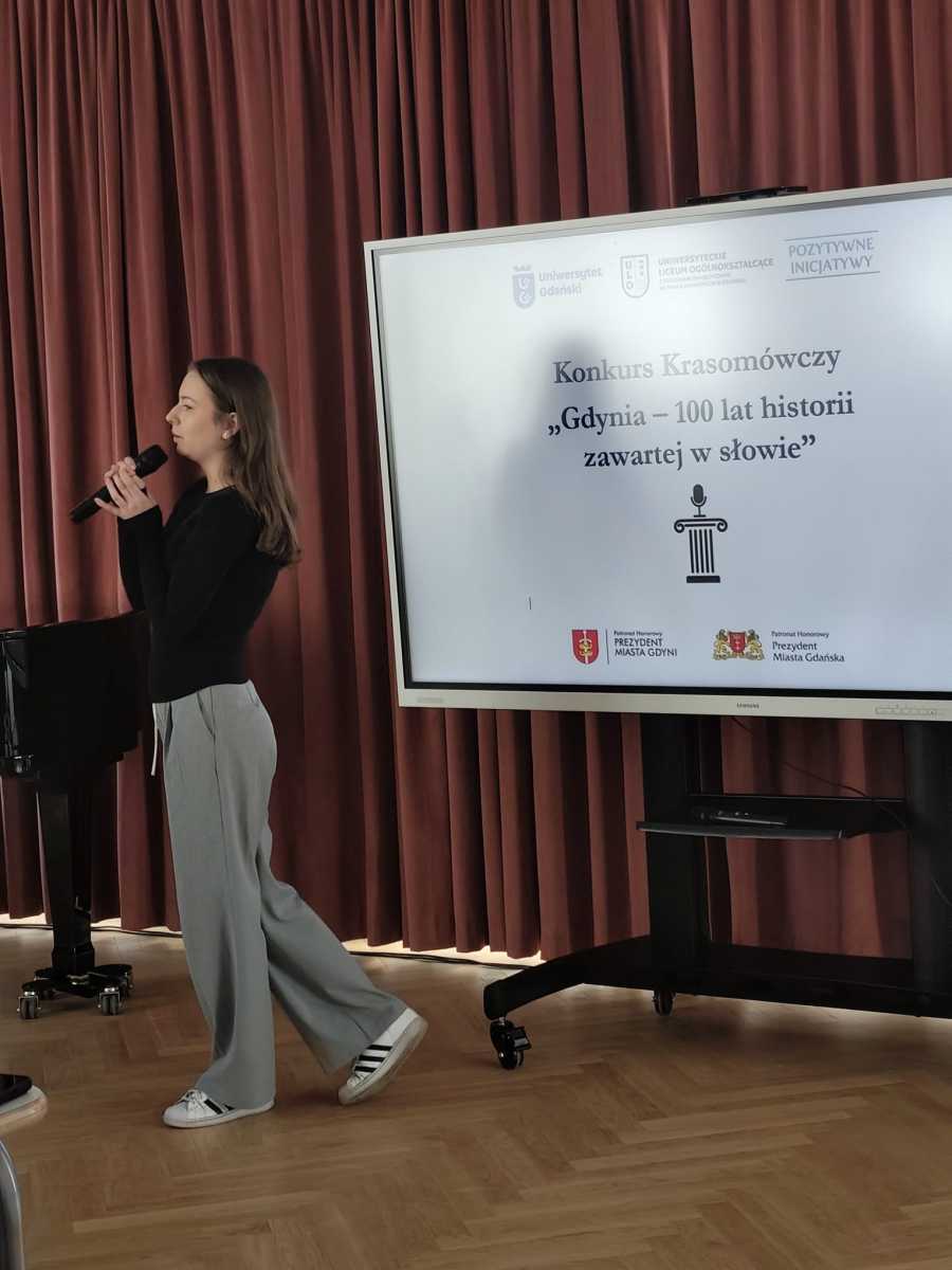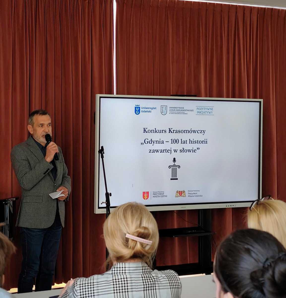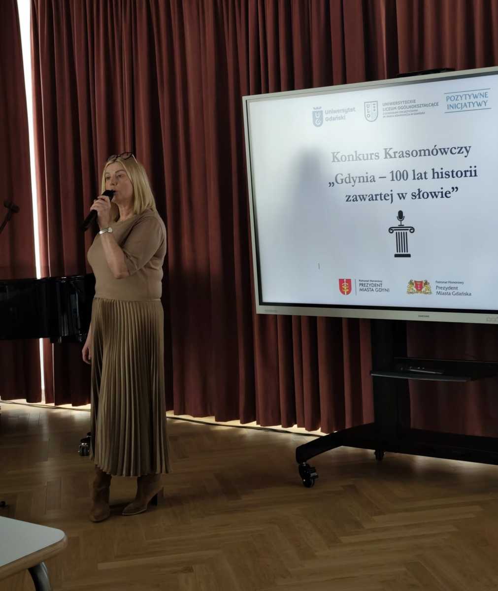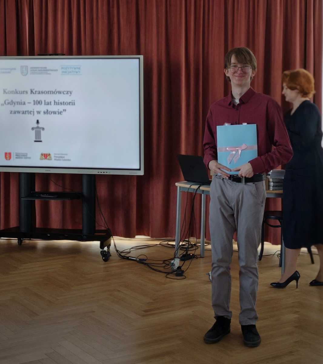 W czwartek, 19 marca, w naszej szkole odbył się finał wyjątkowego konkursu krasomówczego, który zapoczątkował nową tradycję i będzie organizowany co roku. Wydarzenie zostało zorganizowane współpracy z Uniwersytetem Gdańskim, pod honorowym patronatem Prezydentki Miasta Gdańska Aleksandry Dulkiewicz oraz Prezydentki Miasta Gdyni Aleksandry Kosiorek, Tegoroczna edycja konkursu, zatytułowana „Gdynia – 100 lat historii zawartej w słowie”, była częścią obchodów jubileuszu 100-lecia nadania praw miejskich Gdyni. Każdy uczestnik przygotowywał autorską przemowę trwającą od 4 do 6 minut. Wystąpienia musiały być oryginalne oraz wygłoszone z pamięci – odczytywanie tekstu było niedozwolone. Przemowy oceniane były przez zewnętrzne jury, w którego skład weszli eksperci w dziedzinie wystąpień publicznych: dr hab. Urszula Patocka-Sigłowy, prof. UG – językoznawczyni, rysycystka; dr hab. Arnold Kłonczyński, prof. UG – historyk specjalizujący się w historii najnowszej, stosunkach polsko-skandynawskich oraz dziejach emigracji polskiej w Szwecji; dr Piotr Szeląg – wiceprezes Fundacji Pozytywne Inicjatywy, prawnik, teolog i publicysta; Agnieszka Nowakowska – polonistka, gedanistka, laureatka konkursów krasomówczych dla przewodników turystycznych, oraz Ewelina Mendala-Kwoczek – dyplomowana logopedka medialna, neurologopedka, rehabilitantka głosu i oddechu. Podczas obrad jury, publiczność wysłuchała inspirujących prelekcji o Gdyni wygłoszonych przez panią profesor Brygidę Maciejewską i pana profesora Andrzeja Błaszczuka. Tuż przed uroczystym ogłoszeniem wyników finału, wydarzenie uświetniła swoją mową pt. “MS Batory – the lucky ship” pani Agnieszka Nowakowska, zabierając nas w malowniczy rejs legendarnym transatlantykiem. Zwycięzcą konkursu został Stanisław Dorawa z klasy 3c ULO, który zdobył również nagrodę publiczności. Drugie miejsce zajęła Gabriela Pleszewska z klasy 3c ULO, a trzecie – Martyna Tylek z klasy 2a 2LO w Sopocie. Wyróżnienie otrzymała Natalia Jackiewicz z klasy 3c ULO. Serdecznie dziękujemy wszystkim uczestnikom za udział i gratulujemy ich wspaniałych osiągnięć. Zachęcamy do udziału w kolejnych edycjach oraz wspólnego promowania piękna żywego słowa!