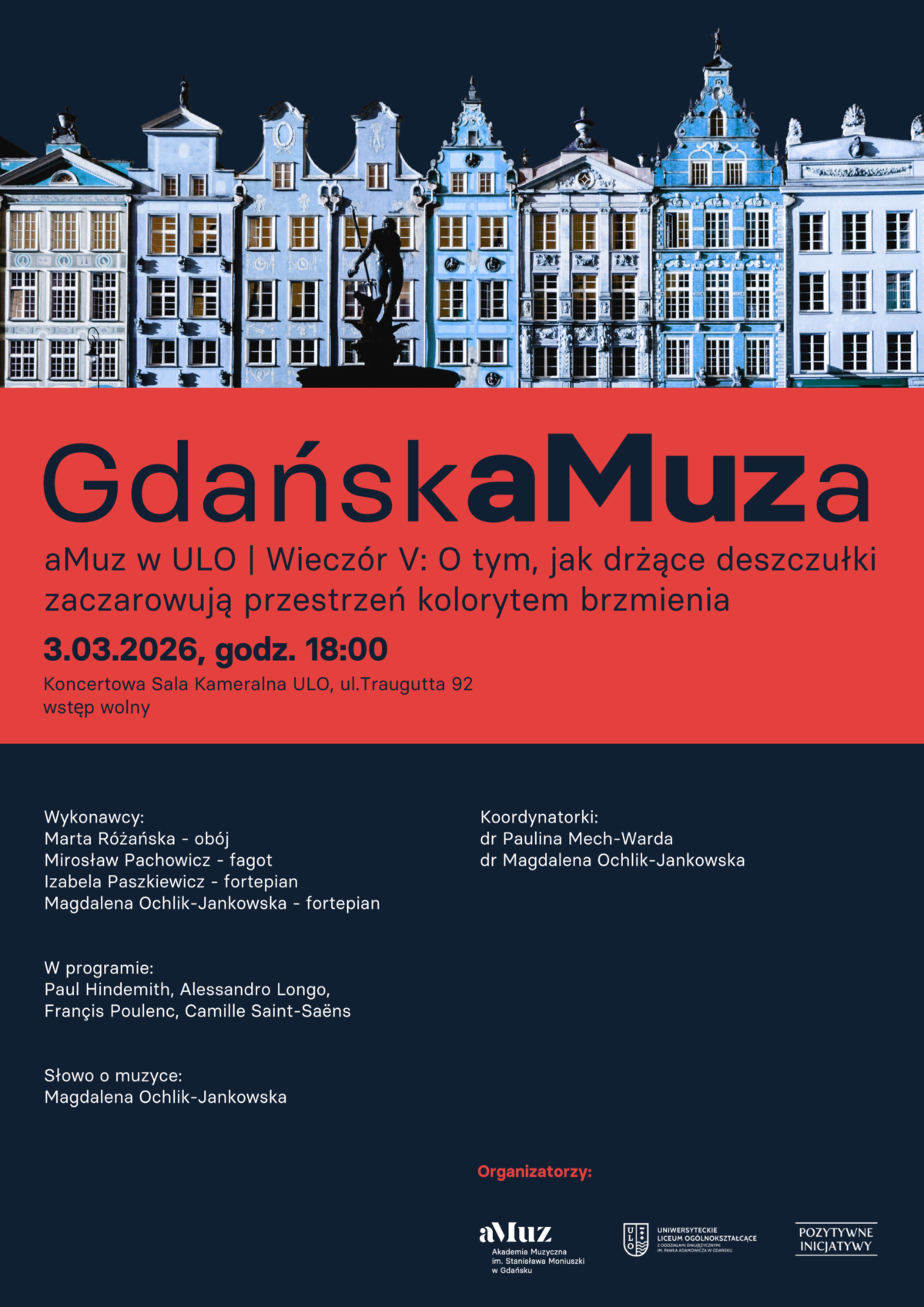 We wtorek 3 marca 2026 r. w kameralnej sali koncertowej ULO odbył się kolejny koncert z cyklu „GdańskaMuza” Edukacja i Inspiracja – aMuz w ULO – Wieczór V: O tym, jak drżące deszczułki zaczarowują przestrzeń kolorytem brzmienia.