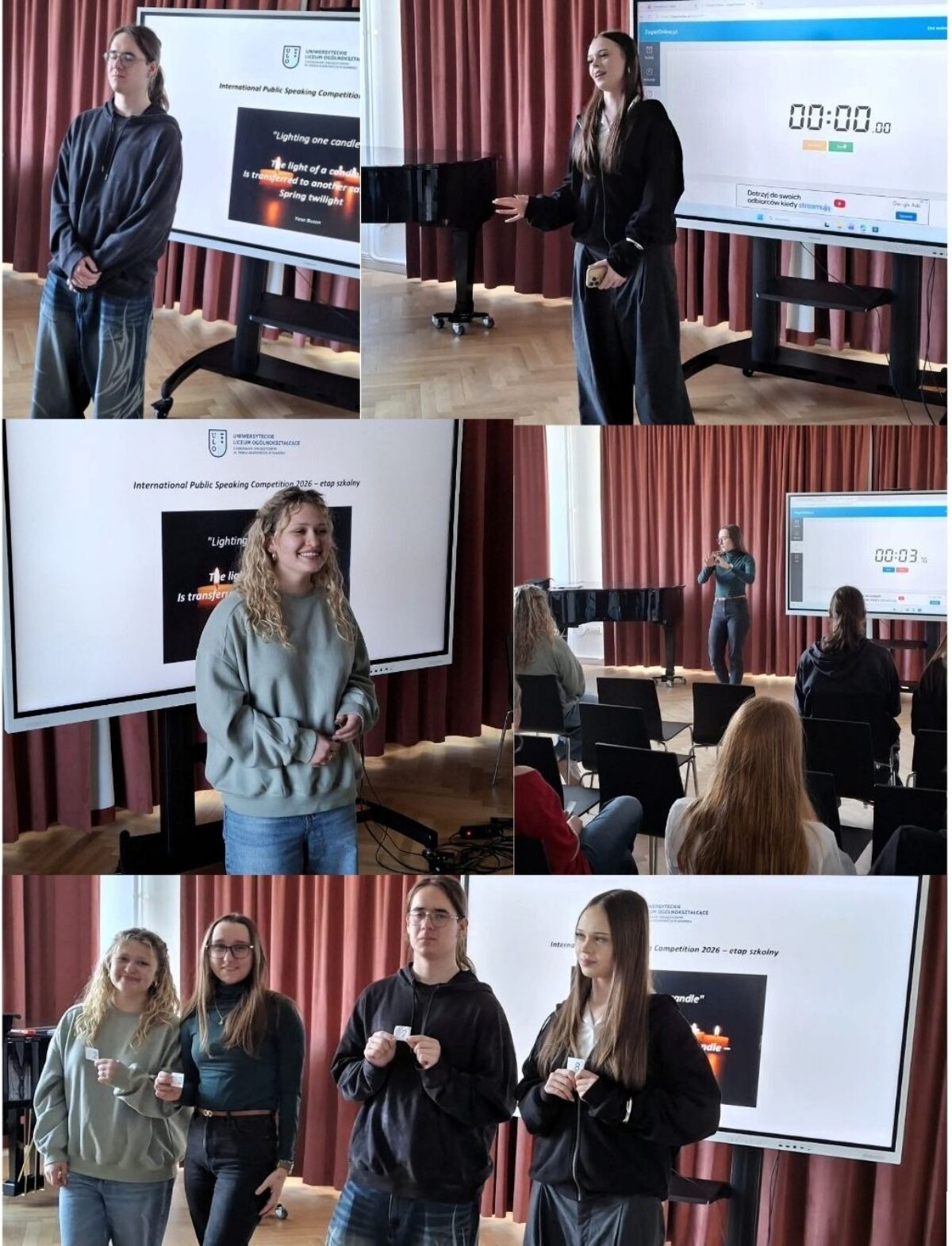 Uczniowie wygłosili przemówienia inspirowane haiku japońskiego poety Yosa Buson ”Lighting One Candle”. Wszyscy uczestnicy wykazali się dużym zaangażowaniem, kreatywnością oraz bardzo dobrym przygotowaniem językowym.20 marca podczas etapu regionalnego na Wydziale Neofilologii UG, Olivia Beagle z IId, Maja Rogozińska i Julia Werbowy z IIIa oraz Miron Walewski z IIIe będą reprezentować ULO.