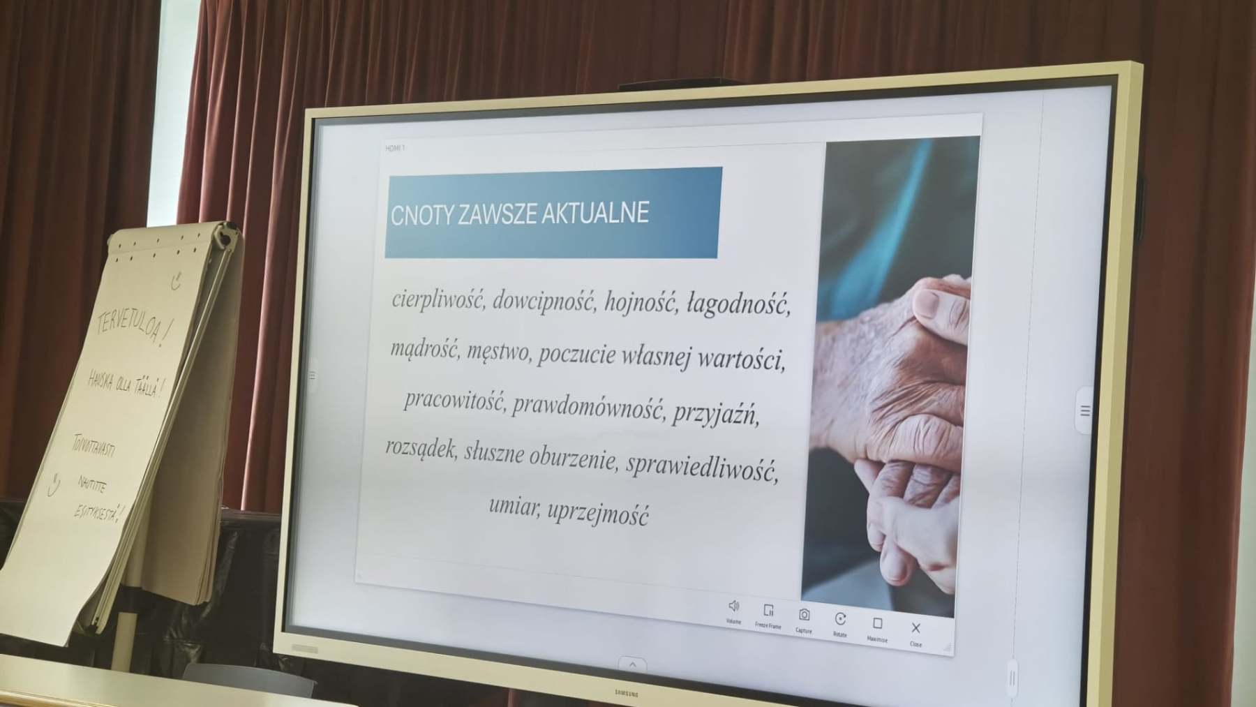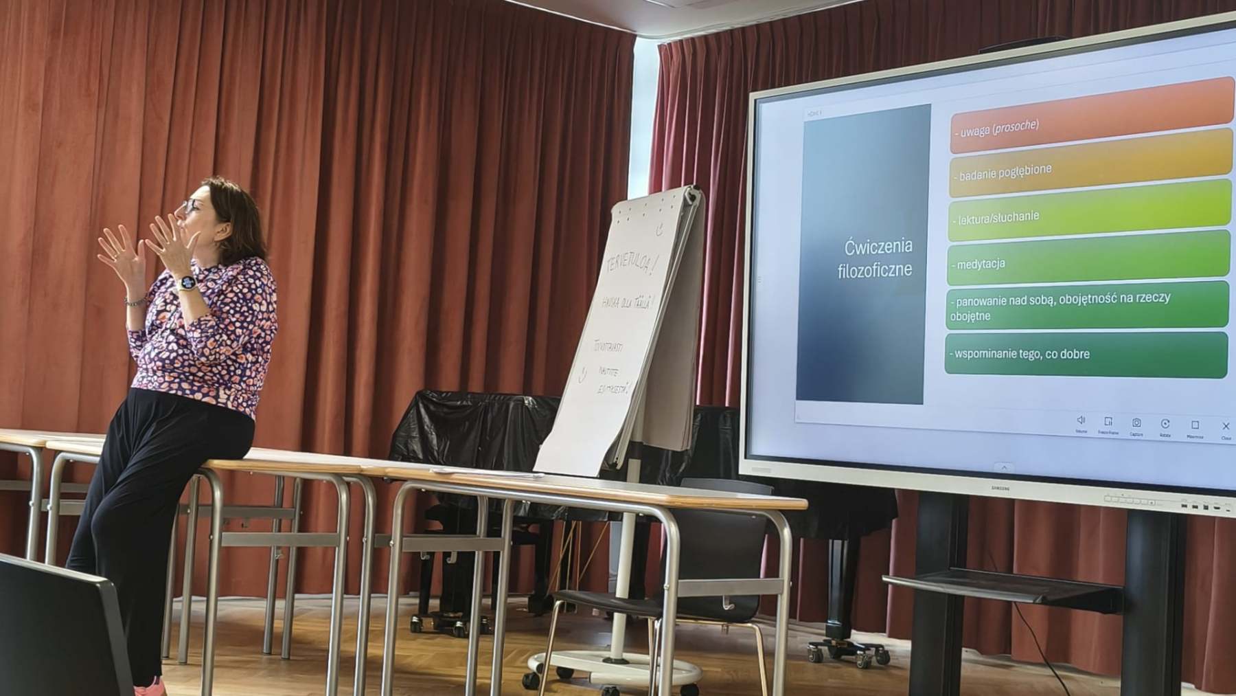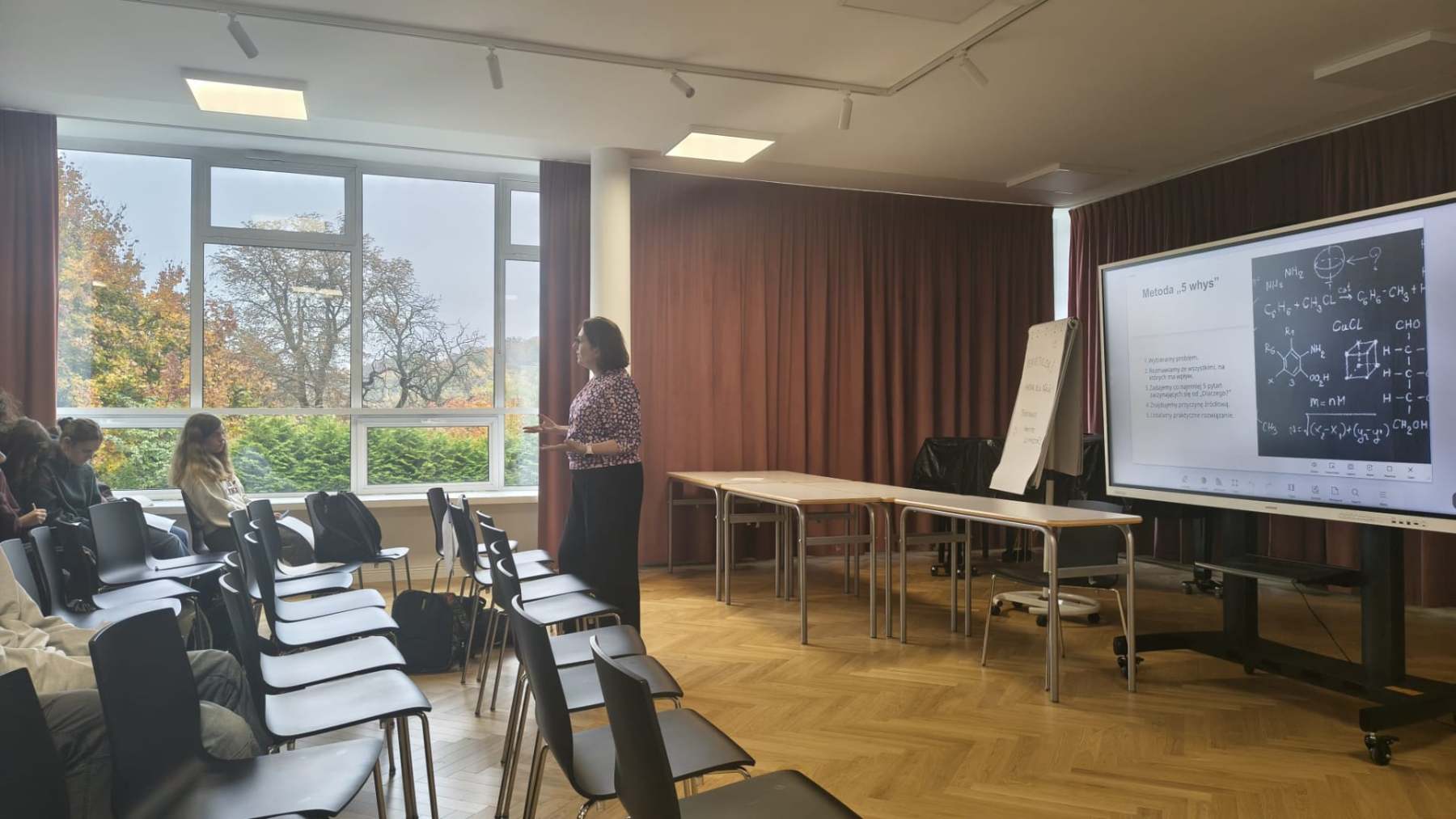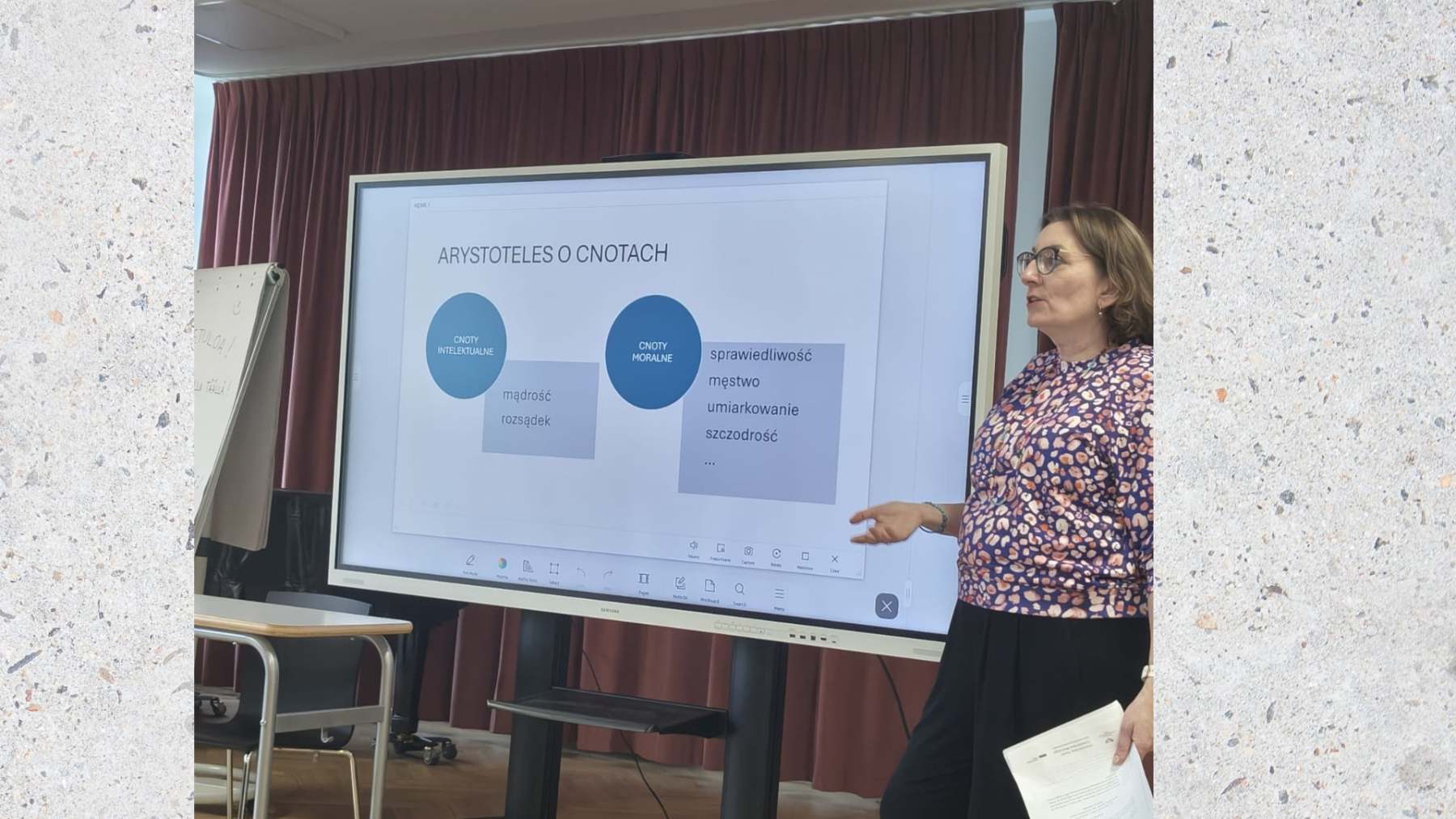 W dniu 23 października 2025 mieliśmy przyjemność gościć prof. Karolinę Kochańczyk, filozofkę z UW oraz Ośrodka Rozwoju Badań i Edukacji z Warszawy. Pani profesor poprowadziła warsztaty dla klas 1d i 1c związane z ponadczasową sztuką dyskursu sokratejskiego oraz nieprzemijalną mądrością Arystotelesa i stoików.